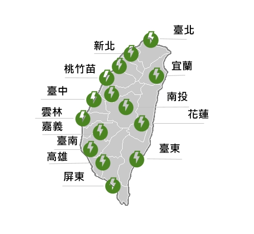 北至南於各縣市提供充電服務站點,包含臺北、新北、桃竹苗、臺中、雲林、嘉義、臺南、高雄,宜蘭、南投、花蓮、屏東、臺東…等提供更彈性的通勤、旅遊充電站點給電動車車主。