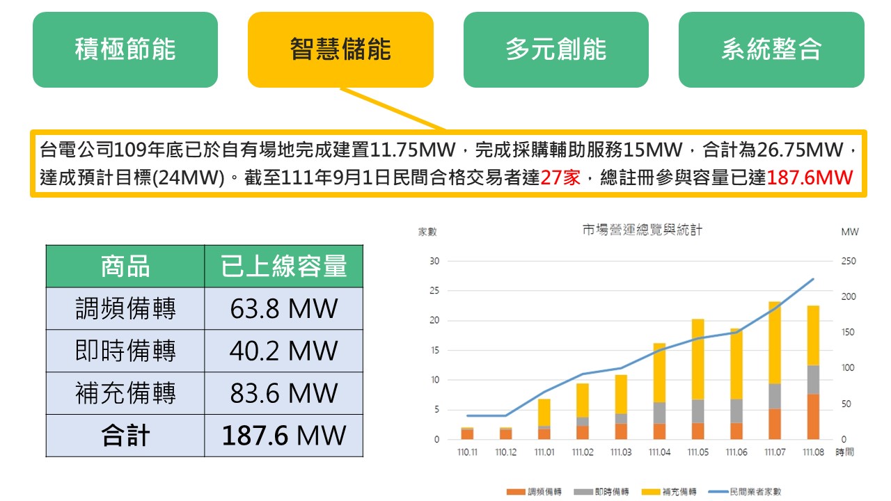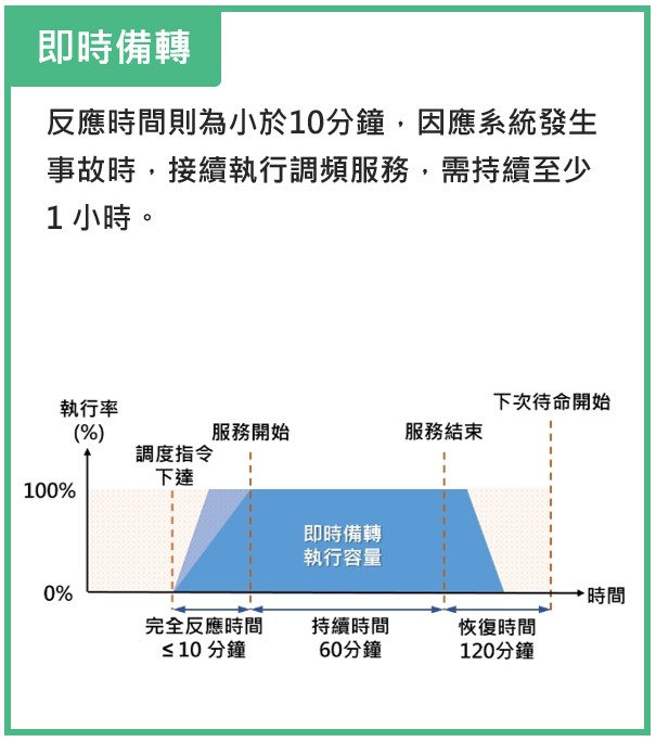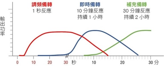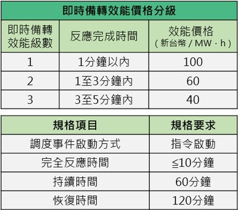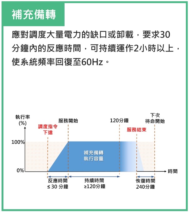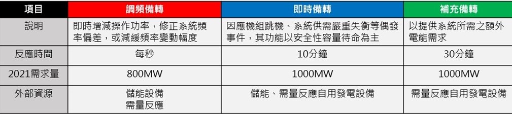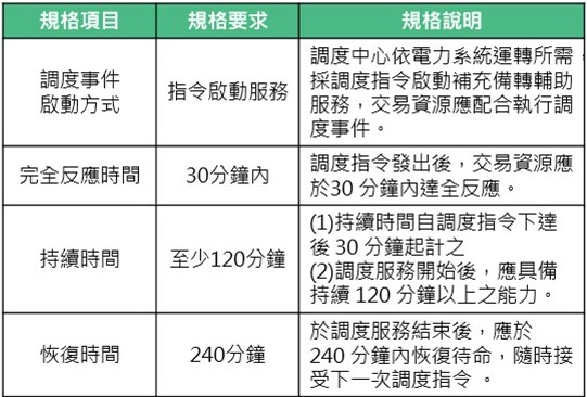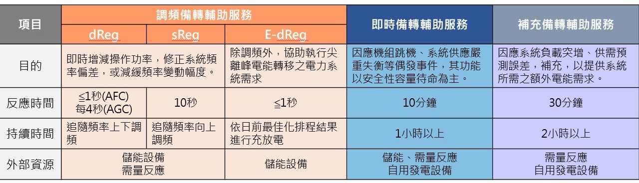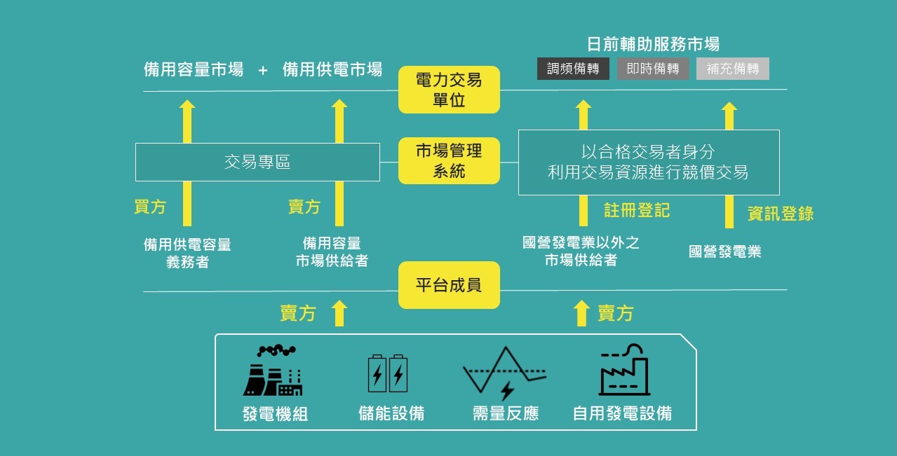 - 日前輔助服務市場,於電力系統納入更多能快速反應、具彈性且多元之外部資源;並設立備用容量市場,提供備用供電容量義務者籌措備用供電容量之市場交易管道。