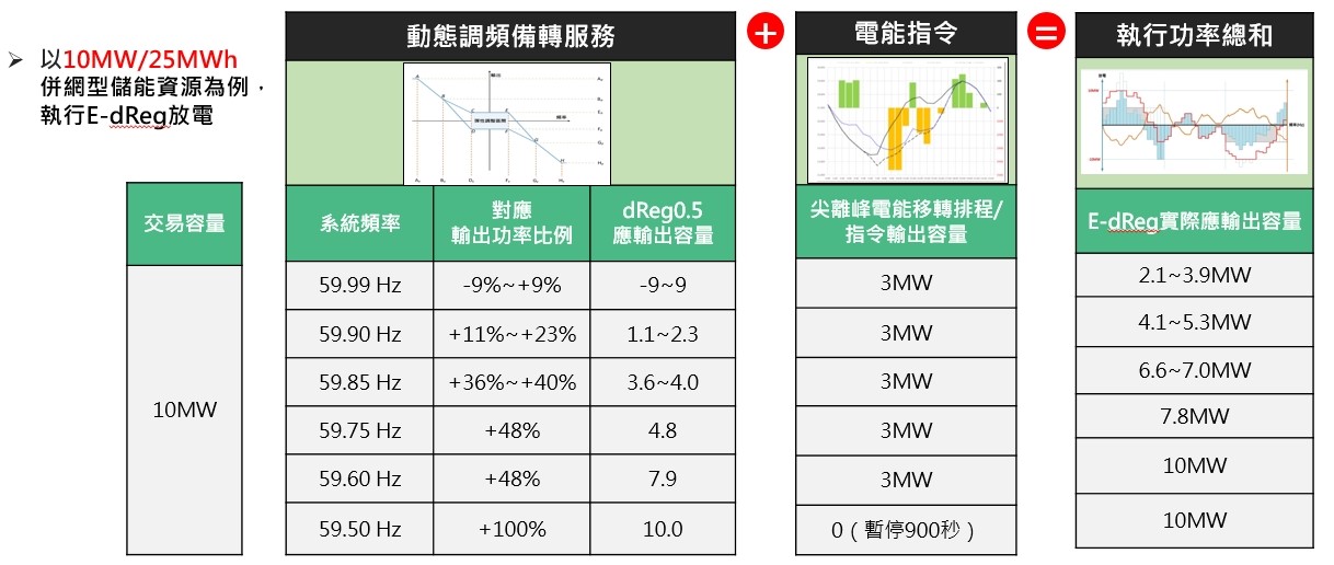 - 參與E-dReg之單一資源,其儲能電能量數額至少應為交易容量之2.5倍,且其交易容量及儲能電能量應分別不低於5MW與12.5MWh