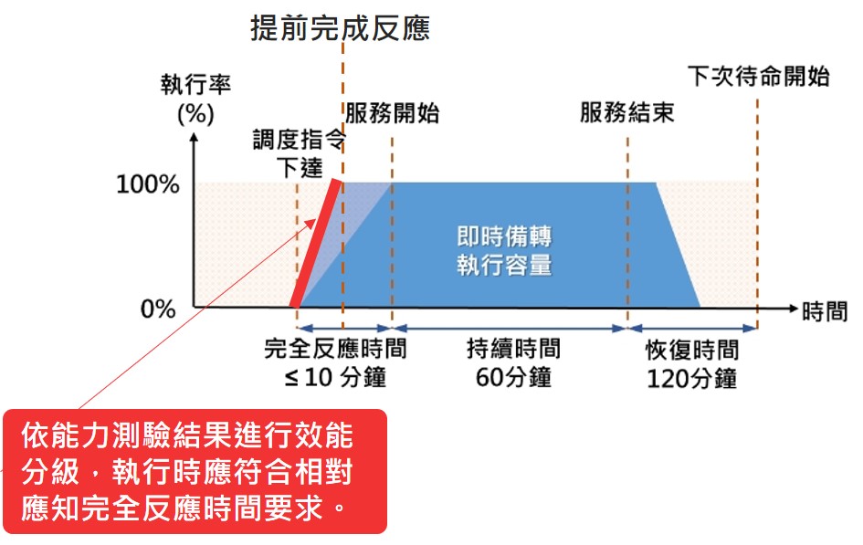 每小時執行率 服務品質指標 小時平均執行率 ≥ 95% 1 95% > 小時平均執行率 ≥ 85% 0.85 85% > 小時平均執行率 ≥ 75% 0.75 75% > 小時平均執行率 ≥ 70% 0 小時平均執行率 < 70% -1 靜態調頻備轉容量 (sReg)每小時執行率 服務品質指標 未達執行條件 1 小時最低執行率 ≥ 95% 1 95% > 小時最低執行率 ≥ 85% 0.85 85% > 小時最低執行率 ≥ 75% 0.75 75% > 小時最低執行率 ≥ 70% 0 小時最低執行率 < 70% -1 即時備轉容量當小時執行實績 服務品質指標 未達執行條件 1 當次執行率 ≥ 95% 1 95% > 當次執行率 ≥ 85% 0.7 85% > 當次執行率 ≥ 70% 0 當次執行率 < 70% -240 補充備轉容量當小時執行實績 服務品質指標 未達執行條件 1 當次執行率 ≥ 95% 1 95% > 當次執行率 ≥ 85% 0.7 85% > 當次執行率 ≥ 70% 0 當次執行率 < 70% -24