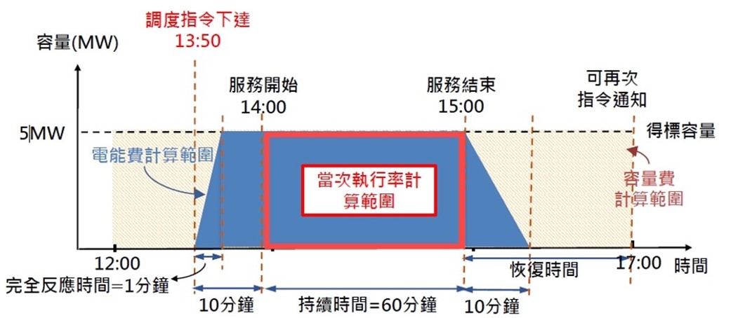 假設某大用戶參加市場,並於12:00-17:00得標並待命,每小時均得標5MW,因系統發生事故,於13:50被調度中心指令通知,要求此交易資源執行調度5MW的容量,用戶於1分鐘內反應。