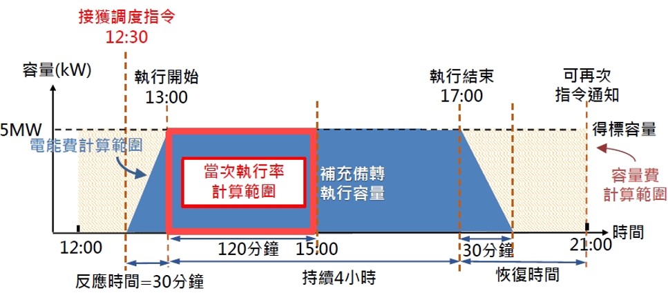 假設某自用發電設備工廠參加市場,並於12:00-21:00得標並待命,每小時均得標5MW,因系統發生事故,於12:30被調度中心指令通知,要求此交易資源執行調度5MW的容量,並持續4小時。