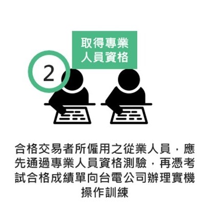 - 合格交易者所僱用之從業人員,應先通過專業人員資格測驗,再憑考試合格成績單向台電公司辦理實機操作訓練。台電公司於訓練通過後,核發專業人員資格證明,詳細之專業人員資格證明取得流程,請參考公告事項2-1。