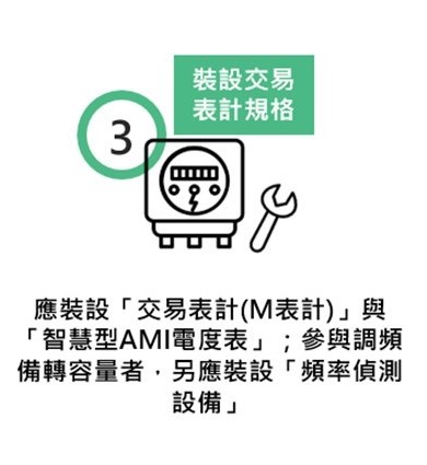 - 交易表計係用以計算執行績效與電能結算,須符合台電公司規定之規格要求自行設置,並負擔設置費用及其相關通訊費用。