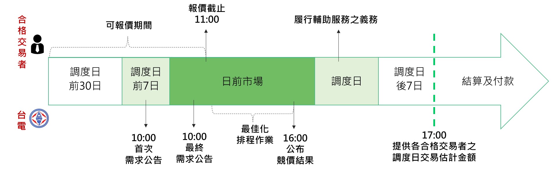 - 需求量公告:調度日前七日十時以前首次公告需求量;調度日前一日十時以前公告最終需求量。
